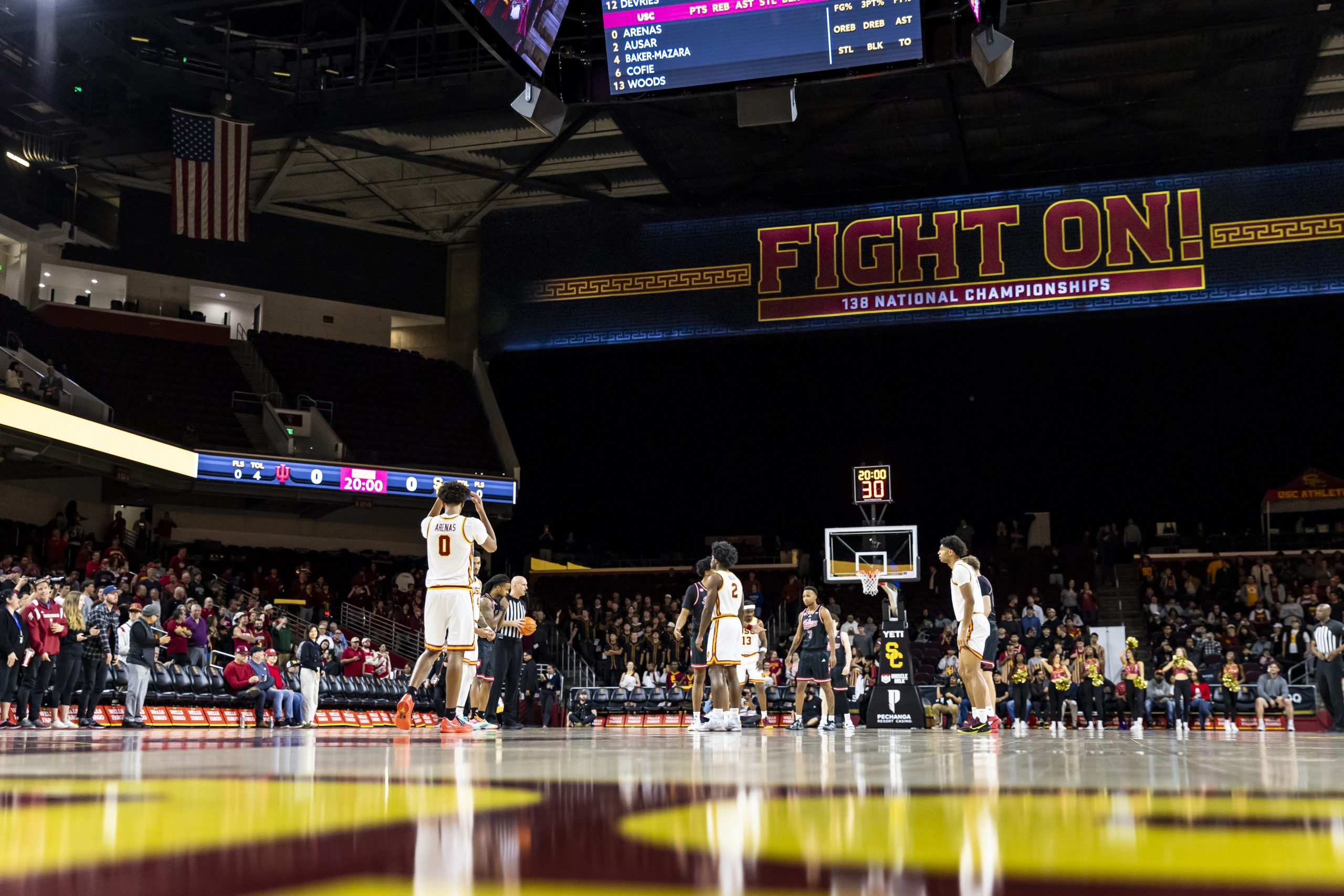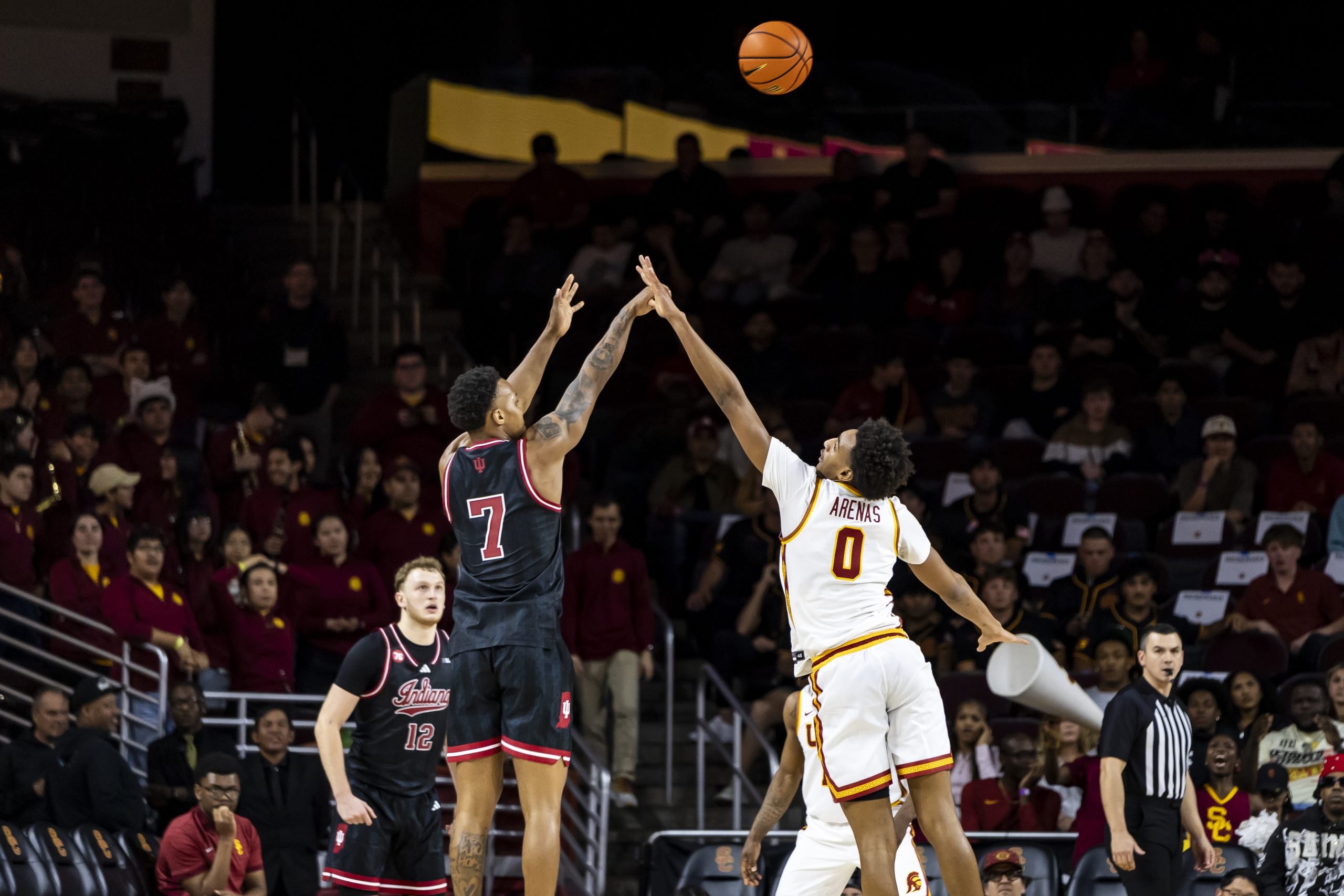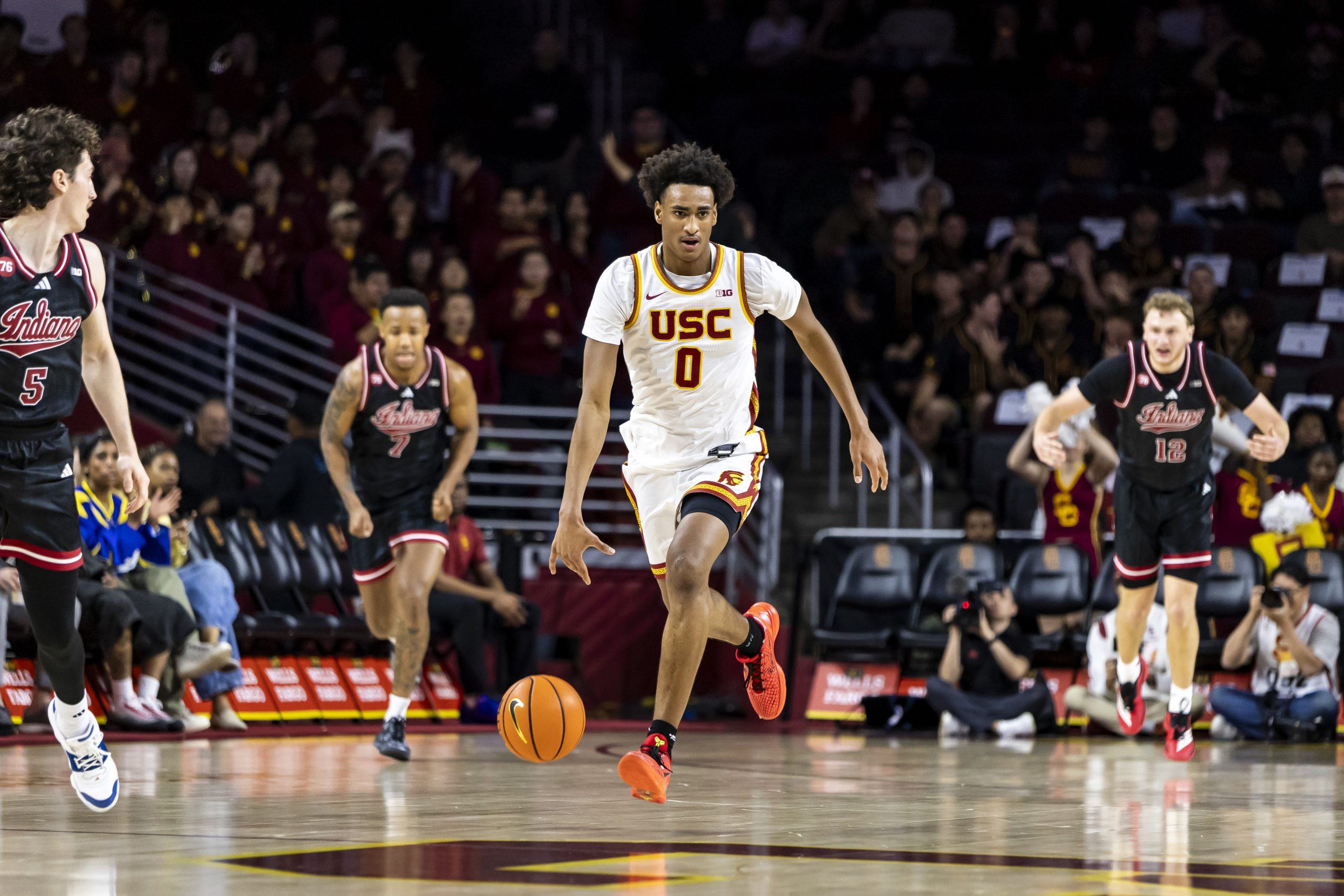 Indiana stayed connected behind Wilkerson, capitalizing in transition after USC failed to convert on multiple offensive rebounds by Dynes. Wilkerson’s three swung the momentum briefly, but Arenas responded by attacking off the dribble, hitting a midrange jumper and finishing through contact to reclaim the lead. Kam Woods added a tough left-handed finish through traffic, and Jacob Cofie cleaned up a missed three with an and-one putback sparking USC’s home crowd.