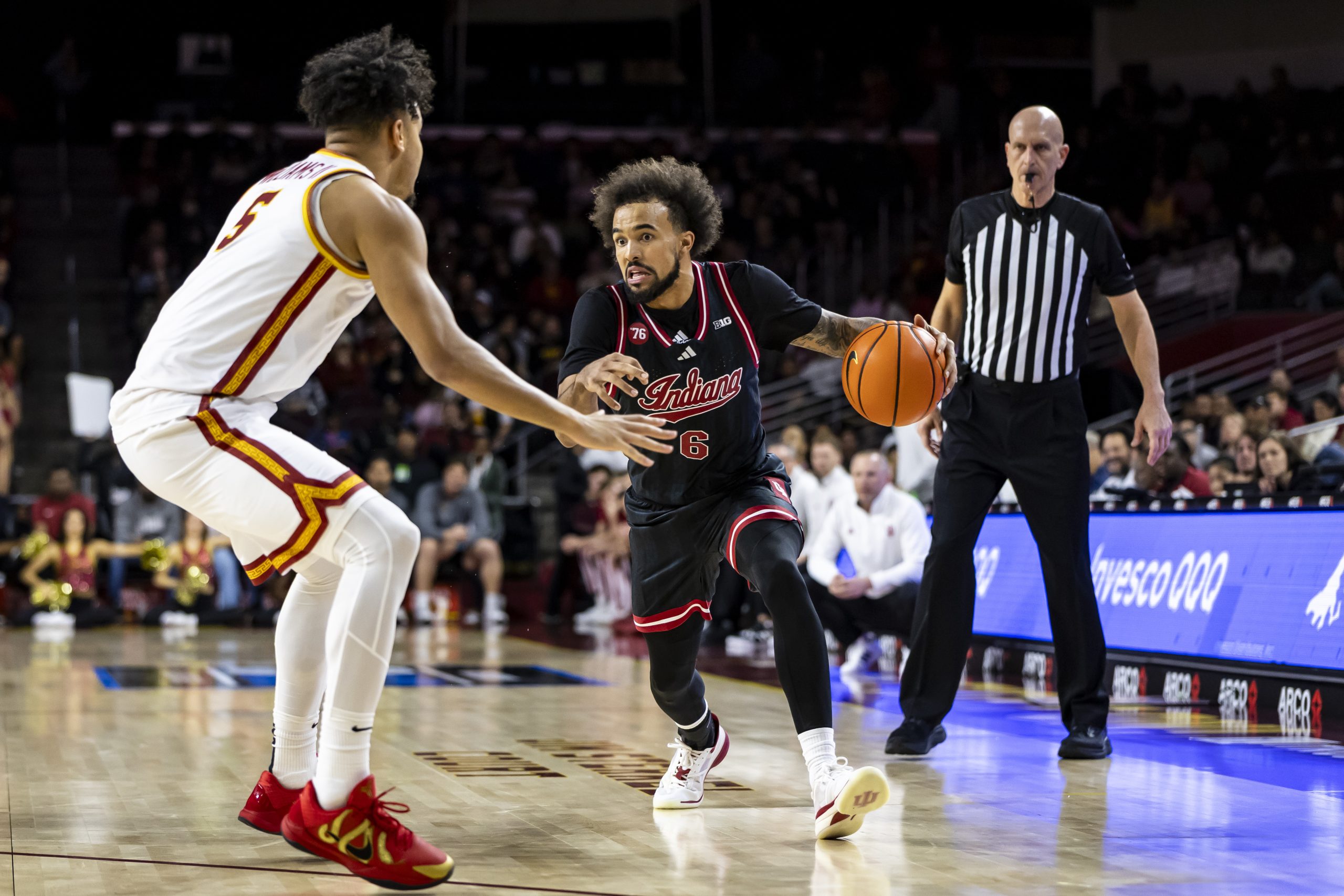 The opening minutes featured quick answers on both ends. Alijah Arenas drilled a left-wing three, while Baker-Mazara stepped into a sidestep triple to push USC back in front. Ezra Ausar facilitated early, tallying three assists before the first media timeout as USC built a small advantage. Defensively, Arenas made his presence felt with a block that led to a dump-off assist through traffic, and USC forced Indiana into a shot-clock violation during a strong defensive stretch.